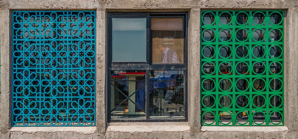 While the building does stand out in its context, it is not inherently flashy by any means. It’s conceived as a simple block of concrete with colorful screens covering most of the openings in its very geometric grid of columns and beams. These screens are not all the same, but follow a set of patterns that are inspired by either traditional jaali screens seen in the historic architecture of Islamabad or by certain Pakistani and Arab motifs. The colors used are taken from the neighborhood’s vernacular culture to bind the new structure into its context. Siddiqui chose to use exposed concrete as the primary construction material due to its ability to naturally change with time, as opposed to using something that would require regular maintenance. The result is a structure that showcases a fusion of modern, contemporary materials and the richness of traditional crafts, and of bare concrete walls accompanied by the festivity of bright colors that add life to both the exterior and the interior.