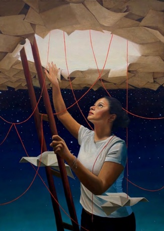 Buland Iqbal’s Untitled captures poised isolation in a sunlit courtyard. Oil brings a woman in a floral blouse and jeans to life on a chair, her expression a mix of resolve and reverie amid brick arches and potted plants. Iqbal explores quiet rebellion: the modern attire against a rustic backdrop symbolizes negotiation between tradition and self. Shadows play across her face, ending in subtle strength, a portrait of becoming, unadorned yet profound. Nabia Gillani’s The Meridian ascends to cosmic aspiration, with a woman scaling a paper ladder under starry voids, red threads anchoring floating sheets. Oil on canvas fuses fragility and ambition: the figure reaches for light amid cardboard clouds, conceiving progress as subtle construction. Gillani ends in transcendent poise, the stars a map of untethered dreams. ‎‎