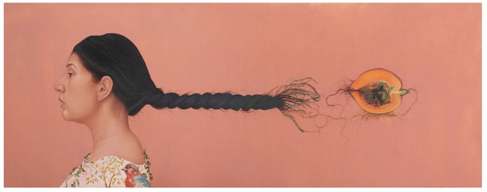 Attiya Usman’s Saffron weaves surrealism into cultural intimacy, transforming the body into a vessel of heritage. Opaque watercolor on acid-free paper depicts a woman in profile, her long braid cascading like roots into a ripe mango below. The hair, dyed with saffron threads from her embroidered blouse, symbolizes threads of identity linking personal to ancestral. The mango, split open with seeds exposed, evokes fertility and decay, a nod to South Asian motifs of abundance. The warm peach tones ground the dreamlike flow, ending in a poignant union. The woman’s upward gaze suggests enlightenment through embodiment. It is a concept that blooms from the everyday (a braid, a fruit) into profound commentary on women’s stories woven into the fabric of tradition.
