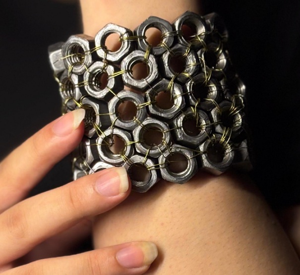 Equally compelling is “Grip of Grace,” where hardware nuts and jewelry wire form a cuff that grips without harm. Here, the forms cluster like gathered thoughts, their hexagonal shapes echoing the geometry as if it’s been woven through. The wire weaves through the nuts in delicate loops, creating a surface that feels both armored and exposed.