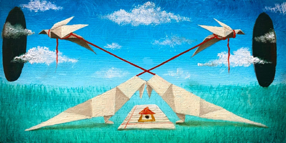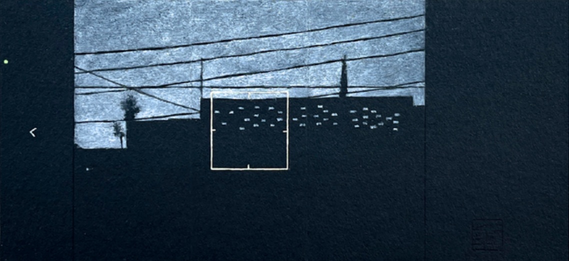 Faisal deepens this theme in “Home.Screen. II,” where urban silhouettes emerge from a starry haze of wires and windows. Silhouetted buildings huddle under a web of power lines, their lights twinkling like distant memories. A white square frames an empty space, perhaps a missing window or a paused video call, heightening the sense of suspended time. The gouache layers build a tactile slowness, mimicking the scroll of a feed that never quite satisfies. Faisal’s brushwork is intimate, each stroke a bridge between archive and mirror, inviting us to question what we hold in our palms: faith or innocence?
