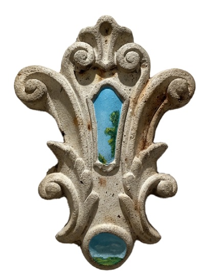 Chandio’s cement casts become canvases for existential musings, grounding abstract thoughts in raw, earthly forms. “You are not the sky” - presents a vast blue expanse cracked like parched earth, oil bleeding into the cement’s porous surface. Swirls of azure and white suggest endless heavens, yet the medium’s weight anchors them to something finite and flawed. It’s a reminder of impermanence—how we chase boundless ideals only to confront our grounded limits.