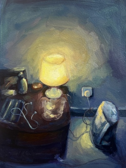 In Too Many Wires, the mood shifts to subtle clutter: a bedside table tangled in cords and headphones, dominated by a lampshade’s radiant halo against navy walls. This smaller-scale intimacy critiques modern entanglement, wires as veins of distraction, yet the glow affirms resilience, a subtle breeze amid chaos. Mirza’s shift to paper lends a raw immediacy, the medium’s absorbency mirroring emotional intelligence. ‎‎