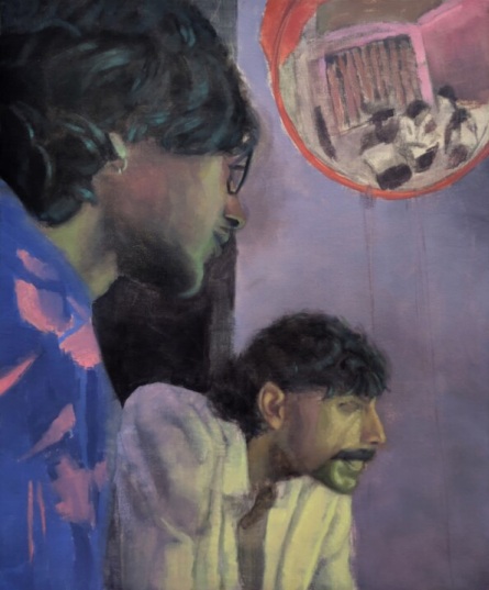 Wahab’s signature style marries hyper-realistic figuration with surreal undercurrents, where light fractures like memory’s shards. In Scour, two figures flank a crimson mirror, their gazes averted yet entangled in a vortex of reflection.