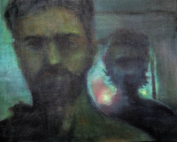 Held in (the not yet) captures two shadowed figures in intimate proximity: a bearded silhouette cradles another’s gaze amid emerald auras, their faces half-veiled in luminescence. Here, light behaves not as illuminator but conspirator, refracting through layered glazes to suggest unspoken yearnings, the “not yet” a liminal space of anticipation.