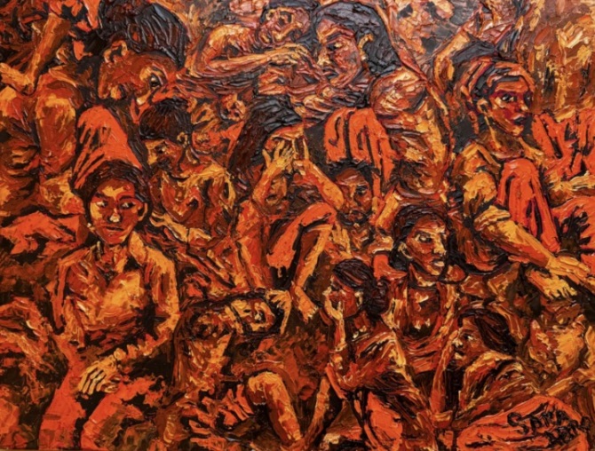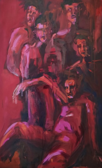 Another from the series masses bodies in crimson haze, torsos fused in primal huddle, evoking the passage of time as a devouring wave. Mansoor’s brushwork, bold and unyielding, layers texture to mimic flesh’s pulse, turning individual contours into a symphony of shared endurance, where silence births cacophonous humanity.