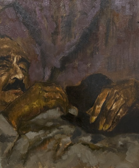Sinless Defeat counters with intimate surrender: two nude forms entwine on a shadowed ledge, limbs overlapping in ochre and sienna embrace, faces obscured in mutual solace. The composition’s warmth belies its title, paint’s thick impasto evoking skin’s yielding texture, a defeat rendered sinless through shared fragility, bodies as bastions against oblivion’s chill.