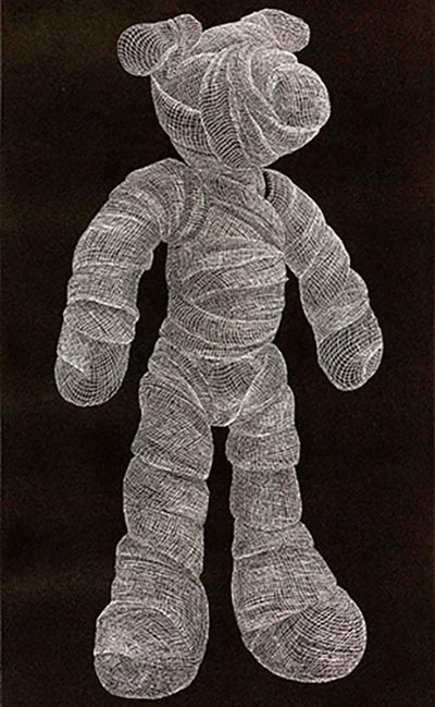 The exhibition is dominated by etchings and prints, frequently monochromatic. Adeel uz Zafar’s Teddy employs etching to thoroughly haunting effect. His signature is a gauze-wrapped child’s toy, scraped cleanly into a pitch-black surface; a silvery, juvenile phantom hovering mutely in a hellish darkness. The piece, however, is about more than its subject matter - Zafar’s successful translation of his usual technique into printmaking, speaks volumes about his pliability as a craftsman and an individual.