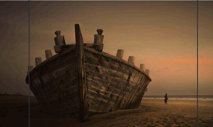The Last Man of the Burnt City presents a haunting image of a solitary figure beside a derelict boat in Pasni. The muted tones and desolate setting suggest a narrative of loss or survival, inviting viewers to imagine the stories etched into the weathered wood and silent horizon.