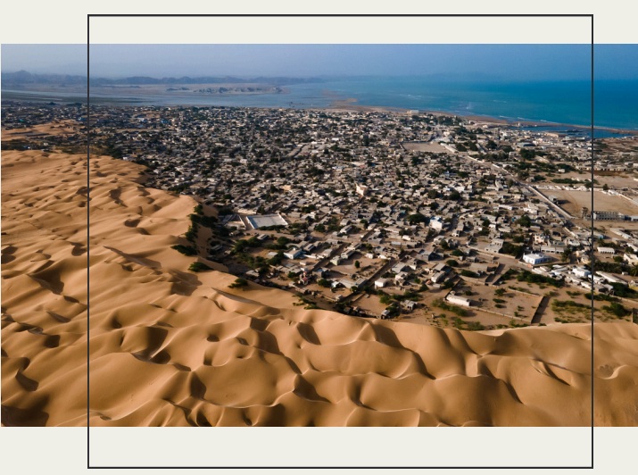 The aerial perspective returns with Pasni - To This Land I Belong. This piece presents a breathtaking view of the golden waves touching Pasni, where the sea meets the desert in harmony. The artist’s description, likening the land to a home that calls the sea in quiet poetry, infuses the image with lyrical quality. The expansive composition captures the interplay of nature’s elements, evoking a sense of belonging both personal and universal.