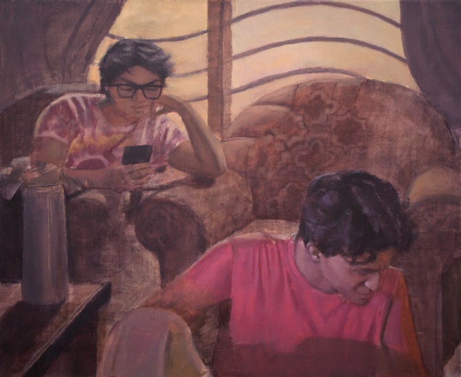 His paintings build on this back and forth between body and space. Reconcile shows two people side by side, facing away from each other in yellow light from curtains. Their hands almost touch, but do not. Earthy reds and blues blend in a careful balance. It feels like Lahore’s hidden yards, safe spots away from city noise. Magic Hour has one person at a window, staring into evening fog. Yellow and deep blue mix softly, making the body stretch out like a long breath at sunset. The glass acts like a thin wall, letting the self spill outside.