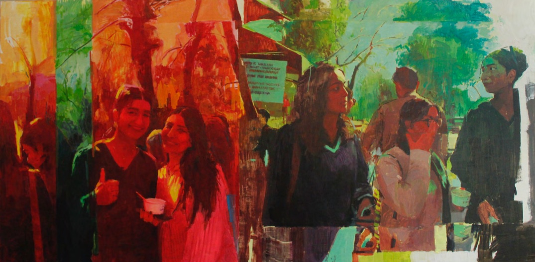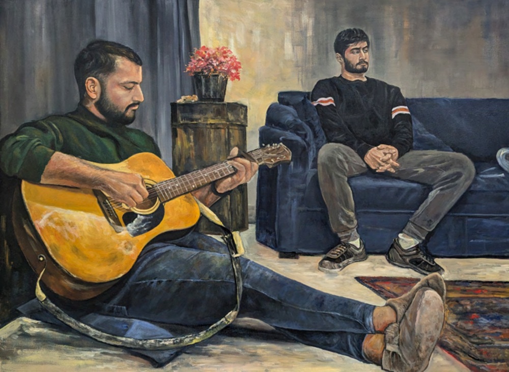 Haider’s palette of muted greens and golds casts the scene in dappled light, while the figures’ slight lean suggests an emotional undercurrent: the grip of memory, as delicate and fraught as clasped hands. Grounded in classical figuration, the work unfurls with quiet grace, revealing how identity often emerges through proximity rather than declaration.