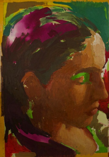 More intimate portraits anchor the rest of her display. Untitled I and Untitled II delve into abstraction, turning faces into emotional terrains. The first presents a woman in profile, her bronze skin set against a burst of purples, greens, and golds. Her emerald eyes slice through the canvas like unspoken questions. The brushwork folds like fabric, dissolving the figure into a dreamlike haze. The second continues this exploration, the warmer tones enclosing a contemplative gaze, lips parted mid-thought.