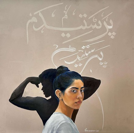 Sumera Jawad explores the depths of human emotion with an unflinching gaze. Drawing from personal experiences and social observation, she gives voice to stories often left untold. Her figures, predominantly female, are more than aesthetically compelling. They are vessels of inner life, emotional complexity, and quiet strength. Jawad’s artworks confront societal silences, creating space for empathy, dialogue, and reflection. In her practice, grace becomes a form of honesty, a confrontation with truth, however uncomfortable or painful. In the artwork Power, this is reflected in the text Parastdam, meaning I loved you well.