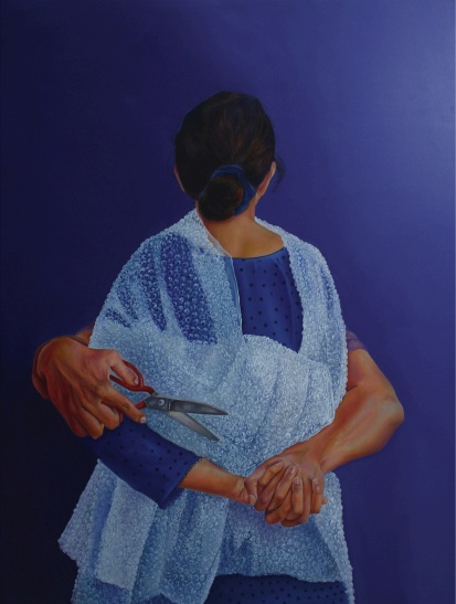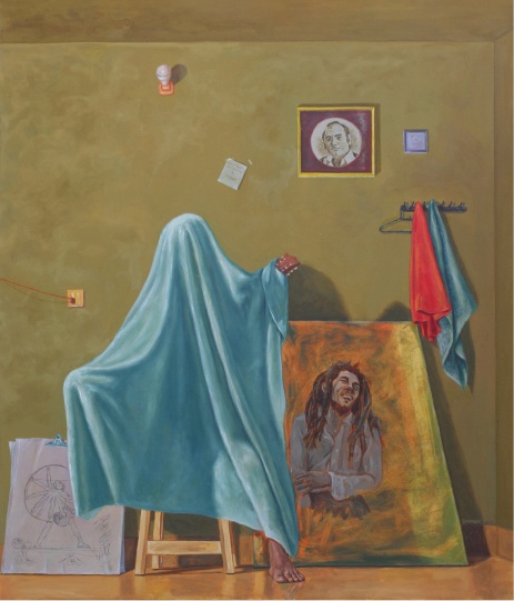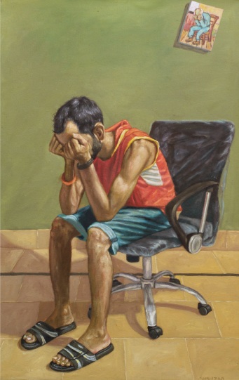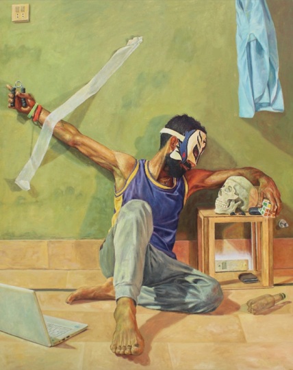 What’s Up Mate: a young man in a blue tank top sits cross-legged on the floor, one arm extended dramatically with white tape streaming like a banner, wearing a makeshift mask and surrounded by casual detritus: a skull, playing cards, and a bottle. The green wall and tiled floor ground the scene in a modest interior, while the theatrical pose contrasts with the figure’s apparent exhaustion or playfulness. Baloch’s careful lighting and atmospheric depth transform this seemingly trivial moment into a loaded tableau, perhaps commenting on performative masculinity, escapism or the absurd rituals that fill empty time. The restrained brushwork invites lingering observation, revealing how mundane spaces absorb and reflect inner states.