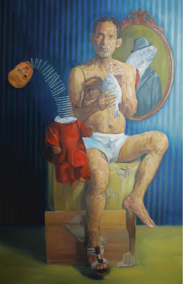 The Portrait: a central figure sits vulnerably in underwear on a makeshift pedestal, holding a fish while a surreal fish head emerges from a mirror reflection and a diminutive red-clad figure dangle nearby. The striped blue background evokes confinement, like wallpaper in a domestic interior, amplifying feelings of exposure and self-scrutiny. The man’s direct gaze and the absurd yet poignant elements, a fish as both catch and illusion, underscore the delusion of self-completeness within narrow boundaries. Jivraj’s visceral strokes convey psychological unrest, turning the canvas into a site of resistance against inherited norms that stifle authentic expression.