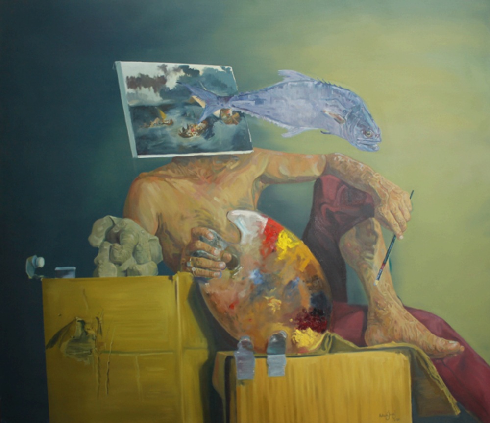 Let’s Paint The Sea! captures a painter in a moment of ironic aspiration. The figure, shirtless and seated amid art supplies, holds a brush while a large fish protrudes from his head, superimposed with a small canvas depicting an oceanic scene teeming with fish. The palette knife and scattered bottles suggest creative labor, yet the fish motif humorously yet poignantly highlights the irony: the artist attempts to “paint the sea” while trapped in personal limitation, much like the fish believing its bowl encompasses the ocean. Through material experimentation, blending painterly realism with symbolic intrusion, Jivraj exposes the quiet compromises of identity, urging viewers to question surface-level perceptions and embrace the discomfort of breaking free from conditioning.