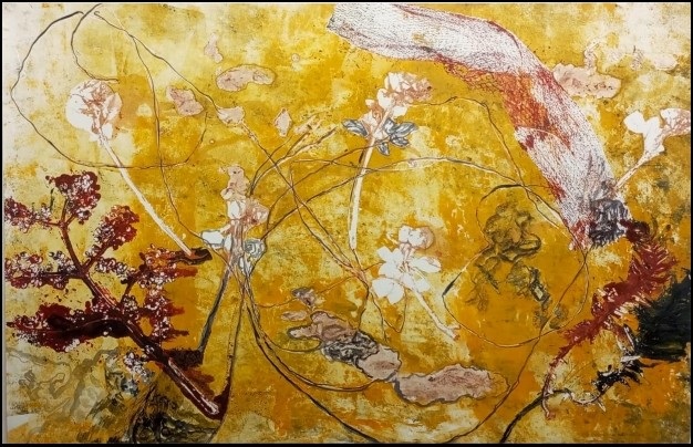 Her work presents a vivid interplay of earthy yellows, deep greens and muted browns, evoking a landscape abstracted from nature, possibly inspired by succulent gardens or wild terrains encountered in her travels. Bold brushstrokes and textured layers give a sense of movement, despite the title’s paradoxical nod to stillness.