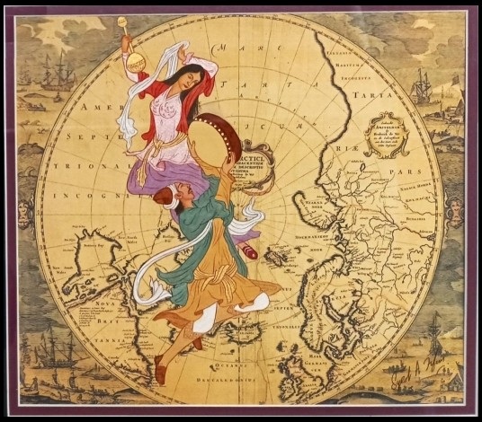 This piece evokes a sense of timelessness, bridging ancient tales with today’s globalized world. The figures appear as if engaged in a dialogue between past and present, while a map bears witness to their journey. A drum may symbolize a call to unity or remembrance, resonating with contemporary conversations on cultural preservation amid rapid change.