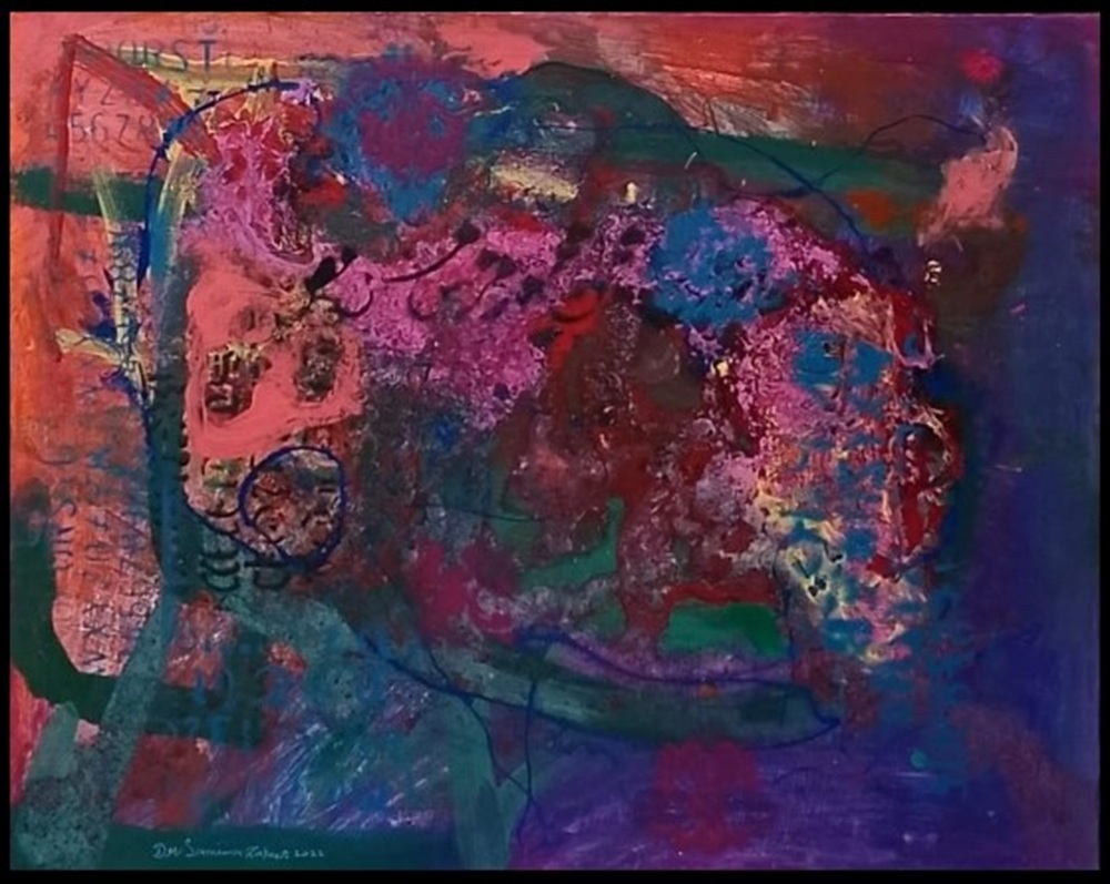 Her abstract language speaks for itself, and the artwork’s ambiguity invites endless exploration. The central figure could be a self-portrait fragmented by life’s experiences, with warm tones symbolizing vitality and darker lines representing challenges or boundaries. Text fragments may be personal notes or cultural references, etched into the surface in a manner reminiscent of the “sgraffito” technique, adding a tactile depth to the visual story.