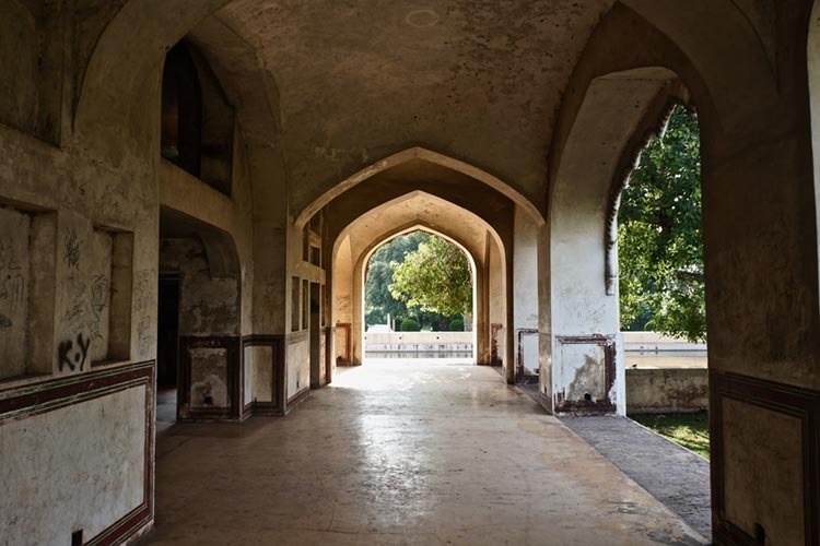 Inside, the baradari reveals its true genius. The central hall soars upward, its height accentuated by the interplay of light and shadow created by the dome's fenestration. The walls, once decorated with fresco paintings and intricate tile work, still bear traces of their original splendor. Geometric patterns in blue and white tiles create a sense of rhythm and movement, while the remaining fragments of calligraphy speak to the Mughal love of poetry and literature.