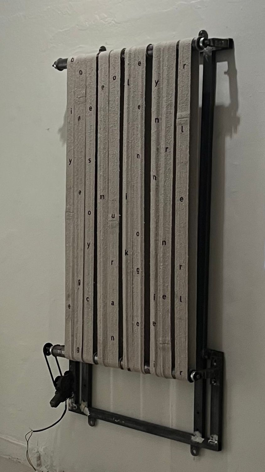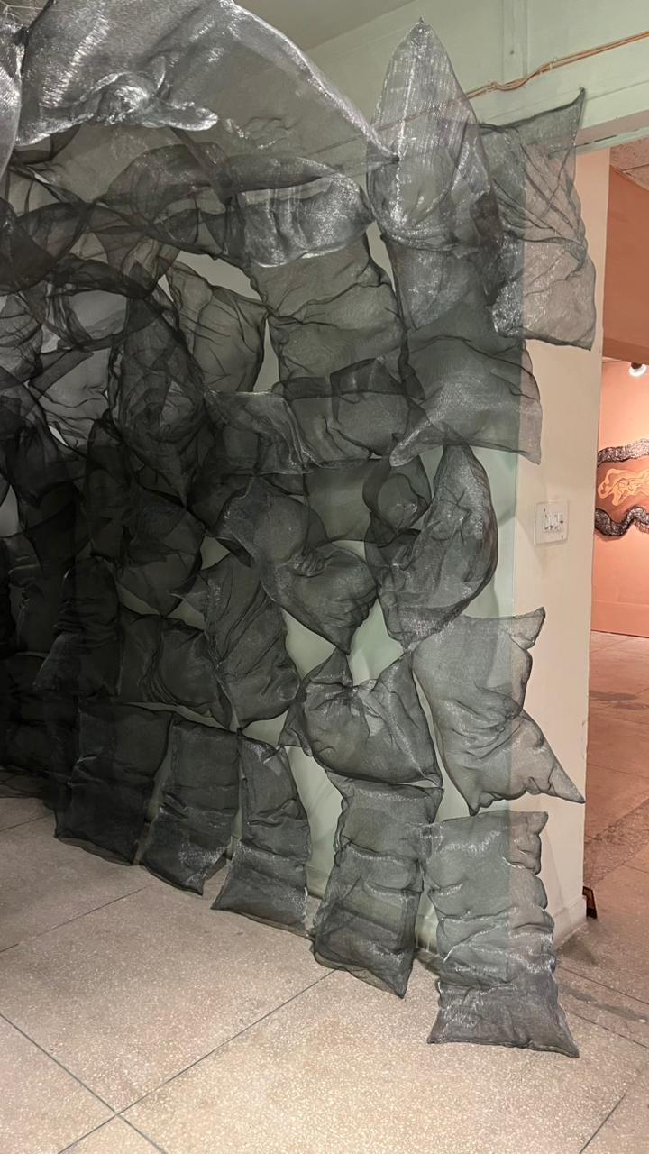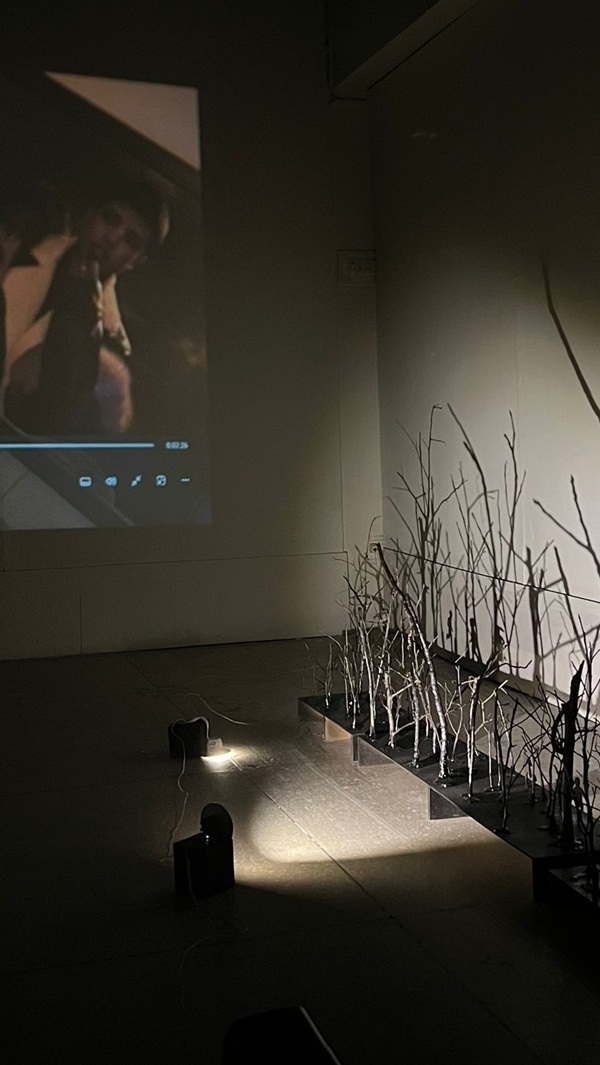 Amelia Ilyas, ‘from the days I have disappeared’, presents a textual exploration of finding the self within a blockade and refusing to acknowledge that it is a loop within a loop. Matching letters to catering silhouettes and not so gentle chants, her space embodies the idea of reincarnation and a stripped self, reaching a point where purity is not shame but grace. The subtle use of wire in her textual poetry charms viewers to take a step back and experience a moment that is meant to be truly felt.