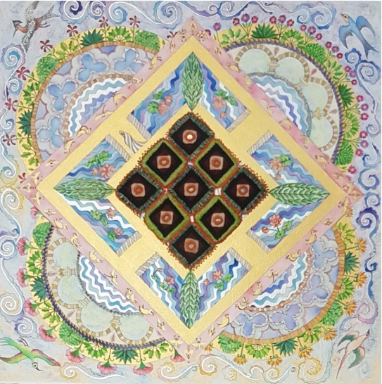 Another unusual portrayal of Sadequian by Lubna, inspired by his quatrain is a figure of cacti, blooming with a variety of cacti-flowers, no apparent features of face but the hands of Sadequain with twisted fingers, over-lapped by Urdu alphabets: Qāf (27thlalphabet), Ṣuād (20th) and Nūn (32nd), like Harūf-i Mūqaṭṭaʽāṭ (disjointed letters at the opening of some of the chapters of the Holy Qūrʼān). In the quatrain Sadequain uses the metaphor of Qāf as common in the names of the two most famous Muslim calligraphers: Ibn Mūqalla and Yāqūṭ, who devised rules of calligraphy and invented six Khaṭ (styles), known as Khaṭ-i Sitta. Comparison of colorless flowers forming border of the panel with colorfully blooming cacti flowers, as Sadequain used to call him the painters of the desperate and detested, not a painter to be displayed in drawing rooms.