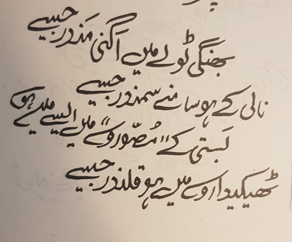 Another painting by Babary is on a quatrain concentrating mole again, with which the beloved is deprived off. Again, stance of a mystic celebration, the depravity is placed akin to the Kalīma-yi Ṭayyaba having no dot, and also in Darūd for the Prophet (pbuh). This is how a mystic views his surrounding, where context of everything is the Supreme Lord. Keeping in view the elements of Sadequain’s imagery, he illustrates through his distinct aesthetic interpretation. Paintings of Babary are enriched with strong compositions, dominating firm-flowing line, displaying ease with which he moves his brush. In this respect, he seems a follower of Sadequain, but a clear glimpse of his style under the sway of Persian miniature painting, with dominating Lapis-blue & turquoise, calligraphic line of Ustad Muhammadi of the late Safavid Era. Mature and quick expression, his paintings bespeak his talent. It seems, he is enjoying the quatrains and equally in amusement moving his brush in a state of trans.