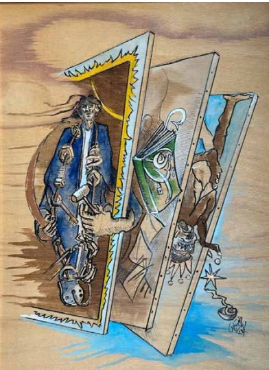 Another satire on the artist community working as commercial contractors, Sadequain calls him a Qalandar. Lubna represents him as very placid, though standing bare-footed on the Cacti-Globe, surrounded by cobwebs, still holding a huge brush and a pen in his arms, along with an ink-pot with qalam in the right hand with twisted fingers forming Arabic letters of Allah. Sadequains fingers of the right hand had automatically shaped into the name of Allah. Under the sway of Sadequain’s self-portrait done in ink and pen, Lubna used the countenance of an ascetic wearing a long shirt of patches, necklace and anklet of beads, while the entire universe roams around him like the dance of a mystic and Sadequain is solitarily at pace with the dance. Encircling his stationed globe are spears, arrows, knives etc. but the ascetic is engrossed in the universal circumambulation surrounding or lying under his feet. He defines in the quatrain that among the looters he steadily stands as a fire-temple and like an ocean before a small dirty drain, but just a qalandar among the art-merchants.