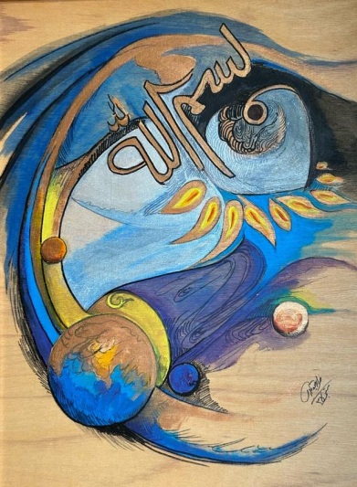 Another Rūbāʼiy focuses a mole on the face of beloved, called by Sadequain as the Nuqṭʽa of Bismillah. There is only one Nuqṭʽa in Bismillah. Zarrar illustrates the spiritual contents of the physical beauty taking the wheatish face as the universe and its mole as central to its existence. He renders resonance of creation of the cosmos, initiated from the One, the dot of Bismillah. It is like the theosophy of Ten Intelligences by Ibn Sina, each sphere of which is yearning to meet its point of creation; begins from and ends at the One that is the Creator of all creations.