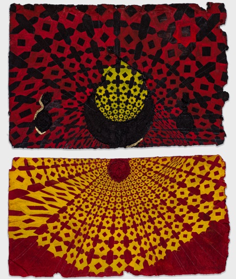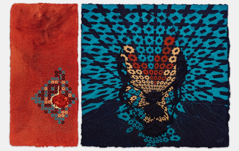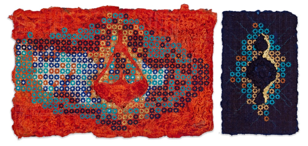 The Tasht-e-Khawab (World of Dreams) extends this dream logic even further. The scale grows, the imagery feels expansive, as if Haroon has broken open the boundaries of the bridal chamber. Her use of plant fiber and gold leaf here feels unworldly, the adornments have become constellations, floating in an imagined sky of memory. The artist seems to weave personal and collective memory into a single tapestry, where adornment transforms from material object into metaphor. Gold becomes memory’s residue, shining even after the body and its boundaries fade.