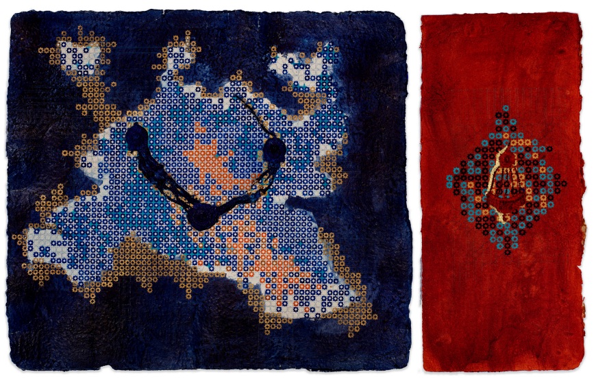 The Kun Ras (Music Lover) series offers a different rhythm altogether. The use of jute plant fiber and direct dye gives these paintings an earthy, tactile quality. Compared to the quiet elegance of her gold-leaf pieces, Kun Ras vibrates with energy as if the sound of tabla or sitar were resonating through the fibers themselves. These works seem to honor another form of adornment not jewelry this time, but the adornment of sound, of rhythm, of joy. They recall South Asian traditions where music, color, and ornamentation converge in celebration.