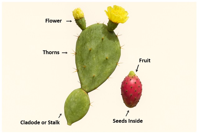 The prickly pear cactus, scientifically known as Opuntia ficus-indica, is a unique plant that grows well in hot and dry areas. In Pakistan, it is commonly called Nagphani or Anarphalī, while in China it is known as Xiānrénzhǎng guǒ, which means "fruit of the prickly pear cactus." This cactus is strong and needs very little water to grow, making it perfect for desert regions where most crops cannot survive.