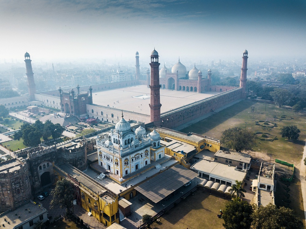 An aerial view showcases the architectural harmony between the Sikh Samadhi and the massive Badshahi Mosque.