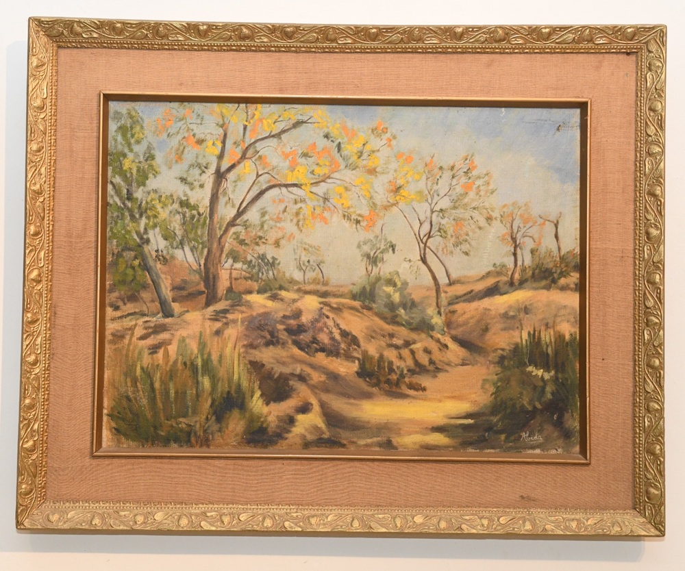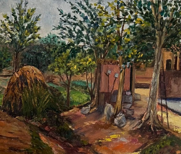 Quick brushstrokes, without prolonged detailing, paved the way for her calm and contemplative mode of expression, especially evident in her landscapes. A single twisted acacia tree composes an entire canvas with its dancing posture, representing autumn, almost bare, with a few leaves about to fall in the wind. A spirit of joy and optimism prevails in the twists and turns of its stem and branches, creating motion in an otherwise static landscape. Another painting renders the lingering yellow light of afternoon with a winding path fading into the distance. Yet another depicts the rugged land of the plateau, forming an interesting skyline with thatched huts on a large mound of earth, approached through a partly sloped path and partly rough staircase, with a beautiful combination of browns and greens. Spring scenes are also rendered impressionistically, depicting forests with dense foliage, where light penetrates through openings and illuminate patches of naturally growing vegetation.