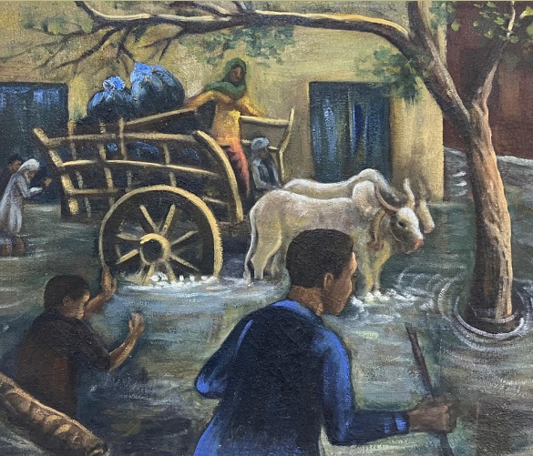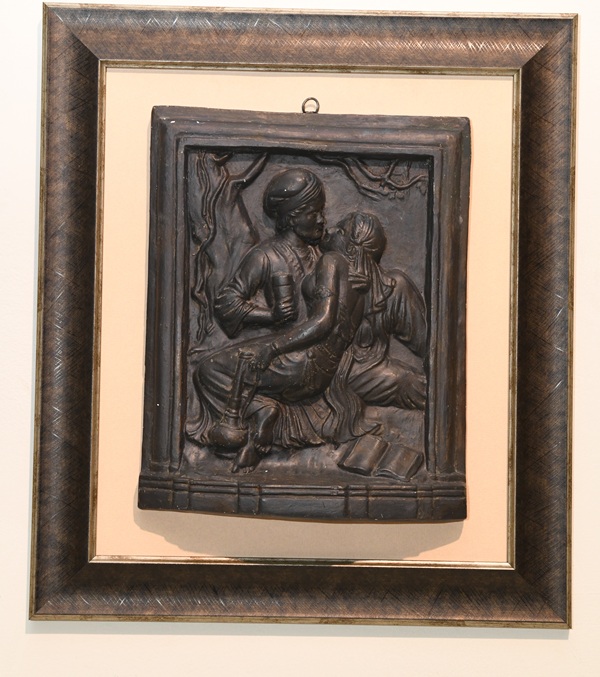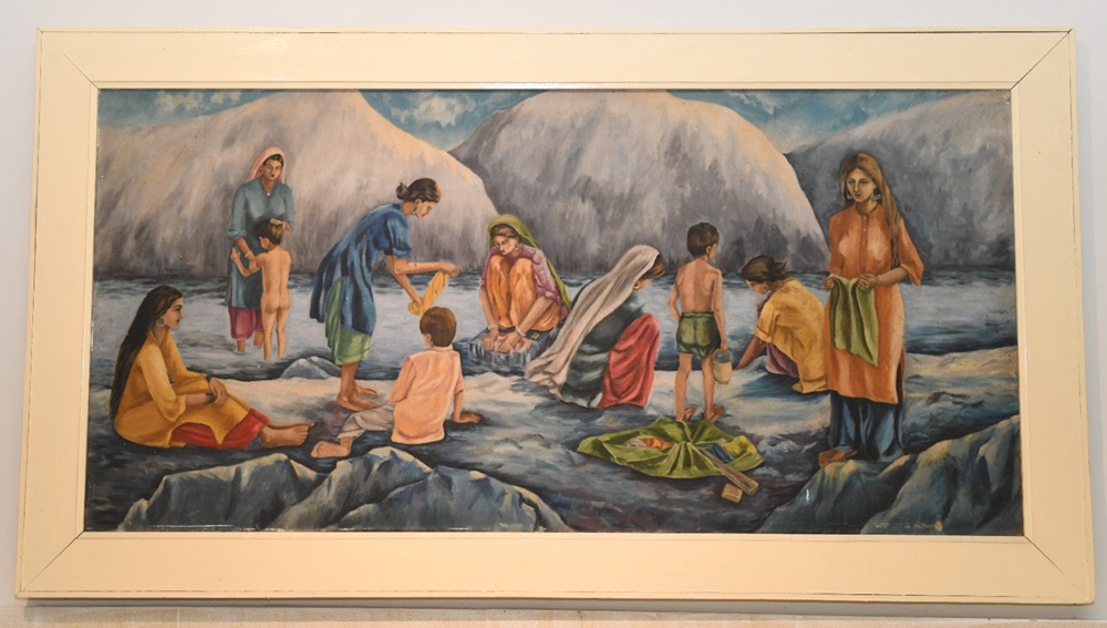 Untamed nature attracted her most; even white lilies celebrating spring are rendered spontaneously, where the delicacy of petals is the focal point, observed minutely yet expressed with immediacy of strokes. Most attractive is the large canvas (3 ft × 5 ft) representing a rural genre of the plateau, where women are engaged in laundry work by a stream, surrounded by large boulders. Young and middle-aged women, in a variety of postures and angles relevant to their activity, are absorbed in their labor. Washing, dipping, squeezing, and drying clothes are all interwoven through compositional devices, directional lines, and gestures. Even children are naturally posed: one older child relaxing in the foreground, another holding a water pot, and a naked toddler stubbornly insisting on something while the mother attempts to console him. Accessories of laundry, arranged as still life in the foreground, include soap, a wedge-shaped washing baton, and colored packets placed on an untied ghathri (bundle), along with adornments of rural women such as rings, bangles, earrings, and amulets, all minutely observed and lovingly rendered. It recalls the Construction Scene of Khawarnaq Palace by the Persian artist Behzad. Besides painting, she also excelled in sculpture, which she taught devotedly to every batch of her students, evident from a single relief displayed in the exhibition depicting a love scene.