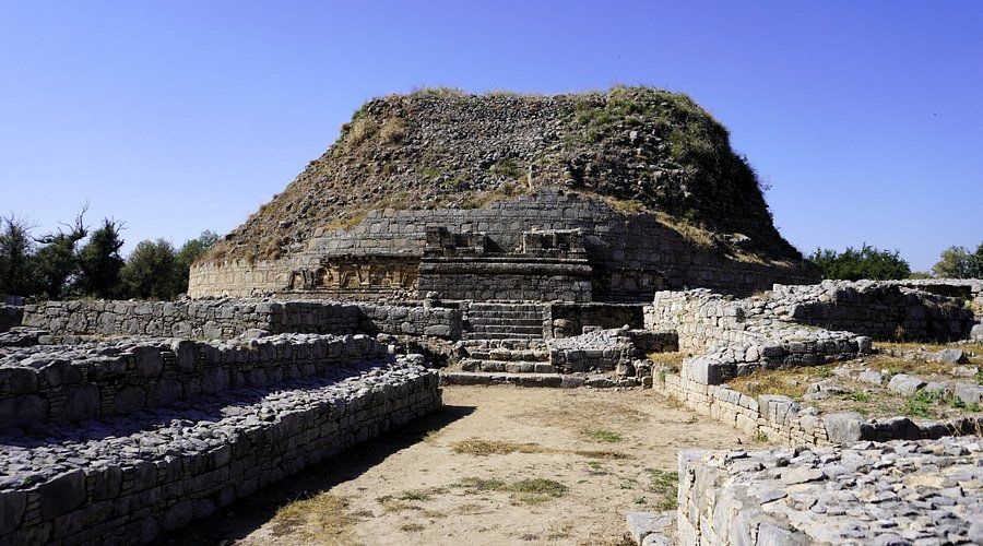 The Dharmarajika Stupa, also known as the great stupa of Taxila, is located 3 kilometres east of the Taxila Museum. The earliest and largest Buddhist monument of the Taxila region, the stupa is believed to have been built by Ashoka to enshrine relics of the Buddha. The primary reason for the importance of the stupa is the discovery of bone relics, believed to be those of the Buddha himself. Even though it is historically controversial and geographically unlikely, but the site has also been claimed to be the one where the Buddha delivered his initial lecture after achieving enlightenment. The complex comprises the main stupa, peripheral stupas and the monasteries, conforming to the Buddha’s recommendation that monasteries should neither be too far, nor too close to the adjacent towns. Destroyed by the White Huns in the 5th century CE, it was excavated by Sir John Marshall in 1913.