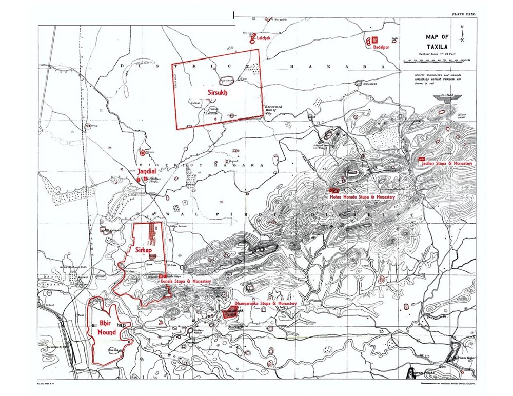 The city of Taxila, renowned for its immense resource of Buddhist ruins, was a bustling centre of commerce and culture for most of recorded history. It was built and re-built many times, changing its urban core often. Bhir Mound, the earliest known urban centre of Taxila was founded around 6th century BCE. Boasting of a Hellenistic grid plain, Sirkap was established and made the capital in the 2nd century BCE. Sirkukh was the last of the ancient cities, founded by the Kushan rulers. The Hindu epics of the Rig Veda and Mahabharta allude to it, and ruins from the Early Harrapan period have also been discovered here. When Alexander the Great invaded the Indian sub-continent in 326 BCE, Taxila was noted as a booming city: well-governed and cultured. Its strategic location on important trade routes of the time endowed that importance upon the city. When Asoka the Great ascended the throne, succeeding his father Bindusara as the third emperor of the Mauryan Empire, it spear-headed the transformation of Taxila into a Buddhist centre.