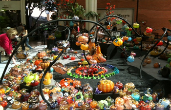 September 2012. Wow! So, so beautiful! Stanford Shopping Mall's main pavilion displays a major exhibit that began early September and will last through October: several tables covered with glowing, glistening, exquisite, artistic and immensely fragile Italian style blown glass pumpkins of different sizes, from an inch to over a foot in diameter, in all colors. Exhibit is organised by Walker and Bowes, an artist husband and wife glass blowing and manufacturing team in Silicon Valley, California.
